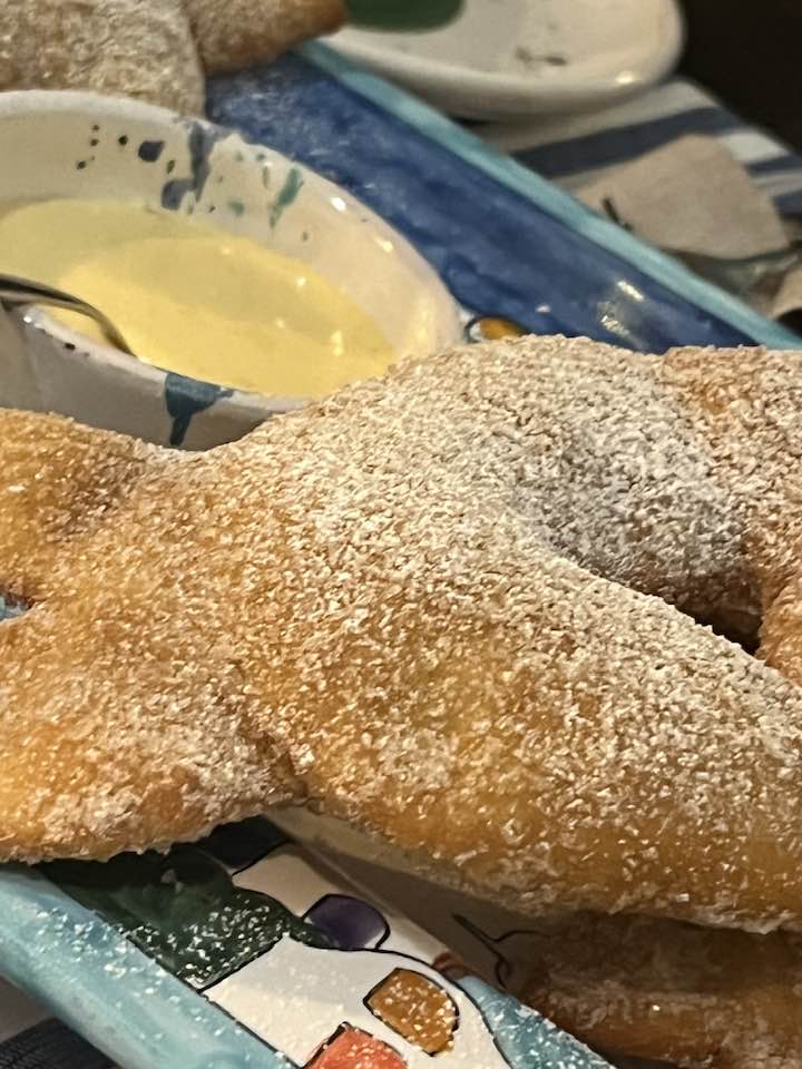 C’è tempo ancora per un panzarotto ripieno di braciola di tonno, con tanto di uvetta e pinoli, e per un golosa graffa fritta da accompagnare ad uno zabaione fatto da Matteo con le uova della campagna sopra Raito.