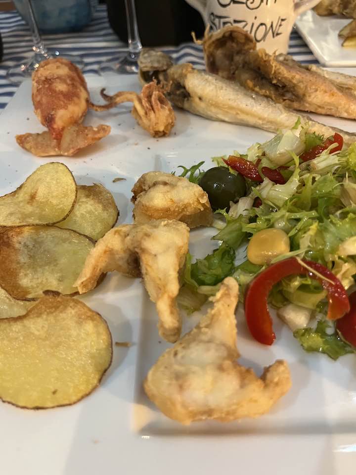 Ma prima c’è tempo per lo sciosciammocca, un paninetto fatto con l’impasto della pizza e la ricotta di bufala, bello pieno di peperoncino. Ed un po’ di fritturina mista non la vogliamo, con due totanetti freschi freschi del mare sottostante?