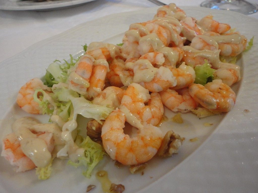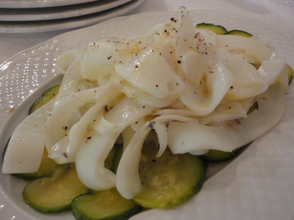 Spazzolate anche queste!!! E’ la volta di un’insalatina tiepida di gamberi su lattughino con noce e salsa Remolade( acciughe, capperi, cetrioli, senape di Dijon e maionese) e anche qui materia prima eccezionale, ma anche estrema perizia nella manipolazione e negli accostamenti… proseguiamo…Carpaccio di seppia a vapore con zucchina croccante e salsa agrumata.