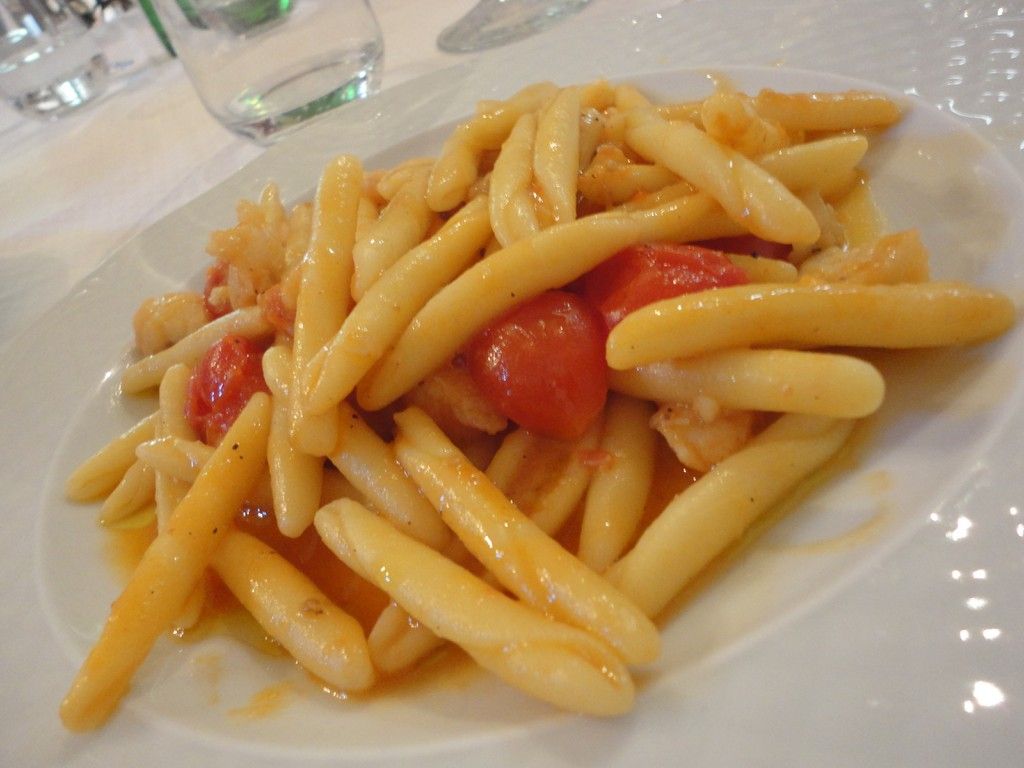 Qui c’è anche la tecnica, infatti la seppia viene cotta a vapore a 100° per 20 minuti, e poi raffreddata e pastorizzata in sottovuoto. Risultato…molto papilloso!!! Ormai satolli, potremmo anche fermarci qui. E chè, un primo non lo proviamo? Fricelli al ragù di coda di rospo e pomodorino Fiaschetto di Torre Guaceto, presidio Slow Food.
