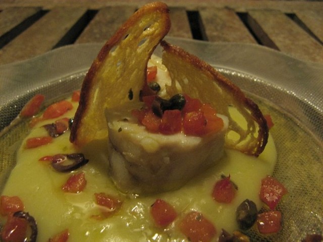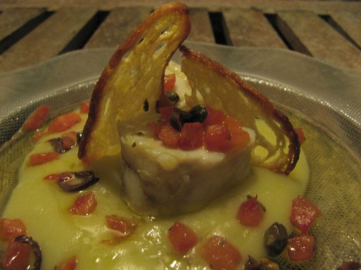 Seguiti da una coda di rospo su crema di patate con crema mediterranea fatta di olive, capperi ed olio extravergine d’oliva.