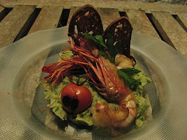 Poi la tradizionale “incapriata” (purea di fave e cicoria) con gamberone viola avvolto in lardo di Martina Franca.