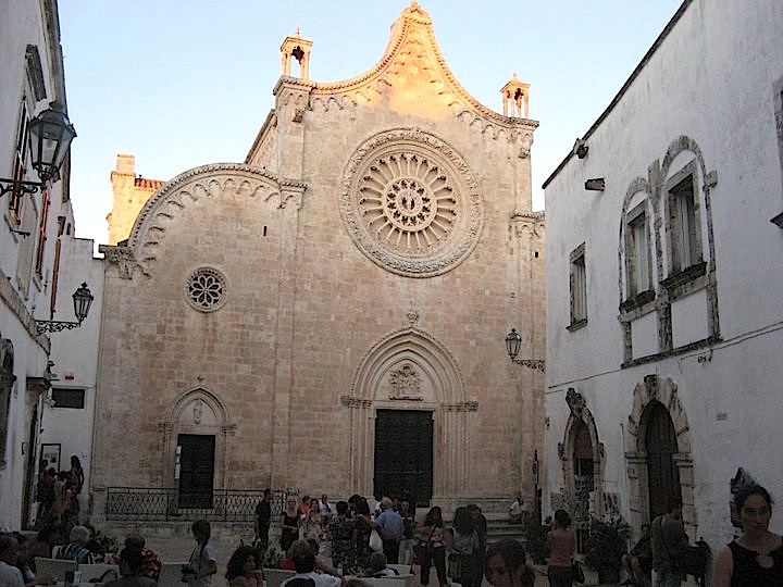 Ostuni è uno dei più bei borghi italiani. Siamo in provincia di Brindisi, nell’alto Salento, vicinialla Murgia Carsica, formata da numerosissime casette di un bianco accecante, arroccate su tre colli che guardano la costa adriatica. In cima al paese, sul colle più alto, spicca già in lontananza la Cattedrale di stile romanico gotico e ci si arriva dopo aver attraversato un incantevole percorso fatto di olivi secolari, terra rossa e muretti di pietra a secco.