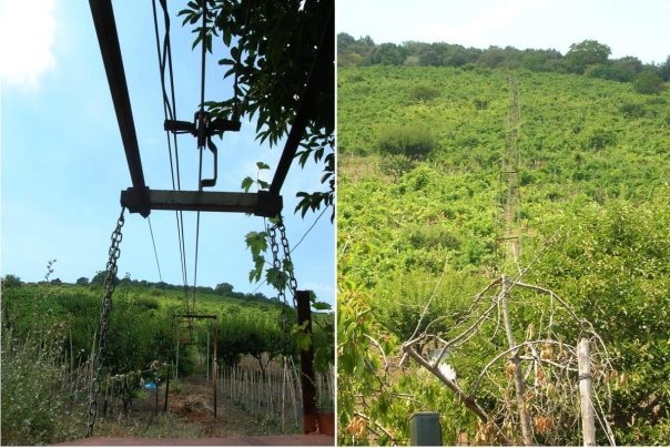 Un muro di vigna di due ettari sul versante est spaccati nel cuore da una funivia, quando arriviamo, si erge davanti. Le viti ad alberello sono ancorate a tutori di castagno alti due metri, saremo intorno agli 8.000 ceppi per ettaro; piante vecchie circa 40 anni che salgono dai settecento metri dove stiamo ai novecento dove mai arriveremo. Ci proviamo, ci abbiamo provato nel tentativo di godere anche della vista che immaginiamo essere di bellezza stupefacente lassù, ma non ci sono terrazzamenti, la vigna sale severa con una pendenza media del 50%, in alcuni punti siamo quasi carponi, la macchina fotografica sbatte sulla terra nera e non fa caldo: si annaspa. Rinunciamo guardando e fantasticando sulla funivia che per trecento metri sale carica di attrezzi, per poi ridiscendere con le uve raccolte in cima durante la vendemmia. Lavoro solo manuale, nessuna macchina che t’aiuta tolta la funivia, ma chi glielo fa fare?