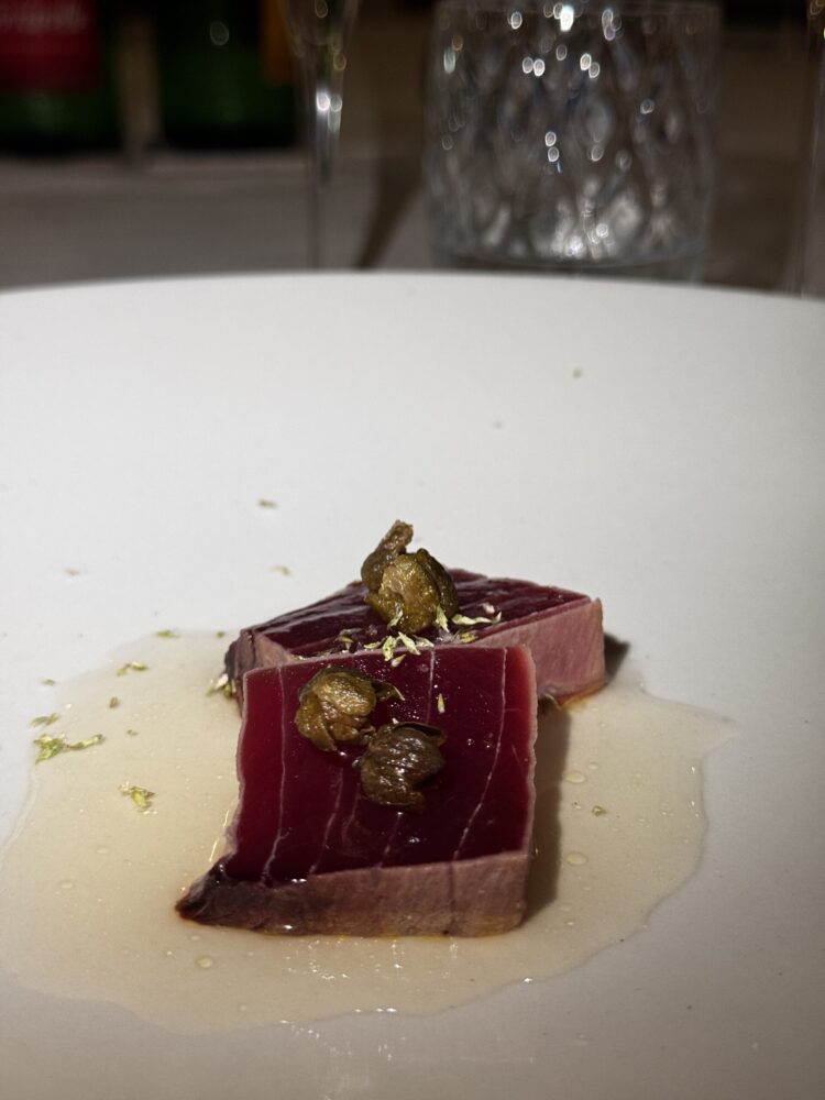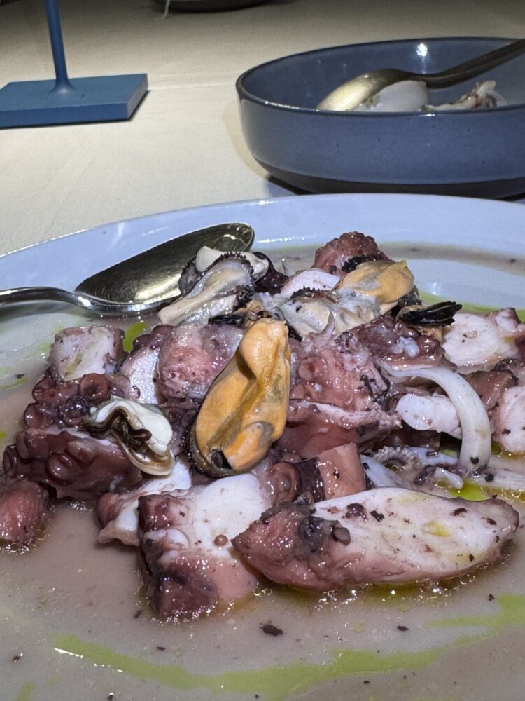 Molto apprezzato anche il sashimi di tonno: fettine sottili di tonno fresco, dal colore sensuale, tagliate con maestria, servite con acqua di pomodoro e cappero croccante. La delicatezza del tonno si sposa con la freschezza acidula del pomodoro, creando un equilibrio perfetto tra morbidezza e vivacità. Un grande classico, l’insalata di mare che è un trend estivo diventa un trionfo di sapori salmastri, con polpo tenero, cozze saporite e seppia delicata, il tutto immerso in acqua di polpo e limone.