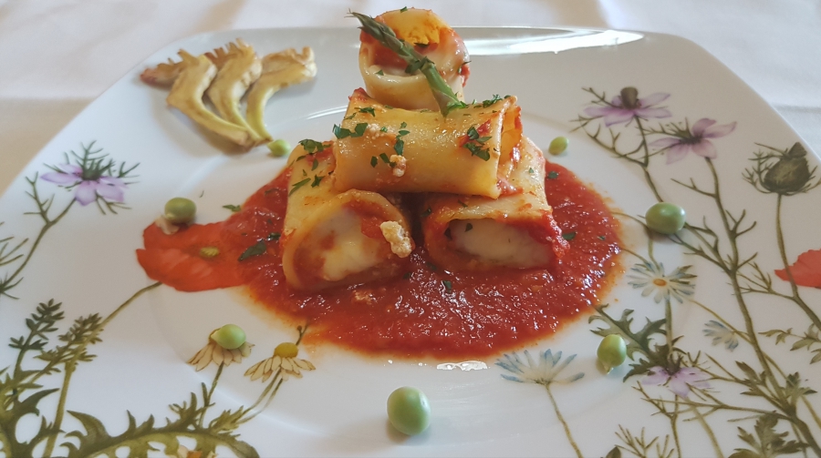Paccheri adagiati sul sugo di pomodoro ripieni di ricotta di pecora piselli asparagi e carciofi.