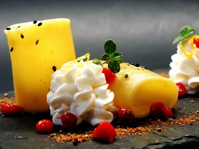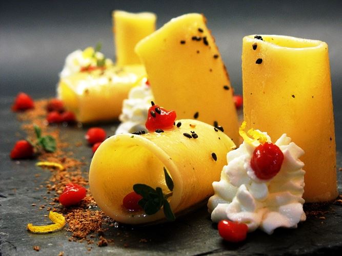 Per le sfere di pomodoro, versare l’olio nel bicchiere del mixer e riporlo nel congelatore per un’ora circa: deve diventare molto freddo ma rimanere liquido e non denso. Mettere in una casseruola la passata di pomodoro, aggiustare di zucchero e di sale e portarla a bollore. Unire l’agar agar e fare sobollire sempre mescolando per 3 minuti circa.