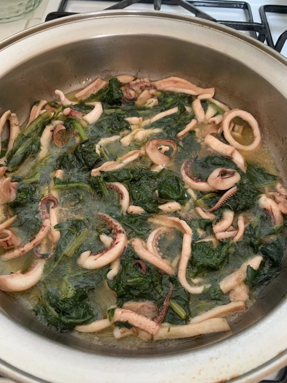 In una padella alta far imbiondire uno spicchio d'aglio e far cuocere per non più di 15 minuti i totani precedentemente puliti, lavati e tagliati a pezzetti, avendo cura di non far completamente asciugare il loro fondo. In una padellina a parte far saltare i friarielli fino a cottura (anche qui bastano 10-15 minuti) in olio, aglio e peperoncino con un pizzico di sale. Unire i friarielli ai totani e far cuocere insieme per un paio di minuti, non di più.