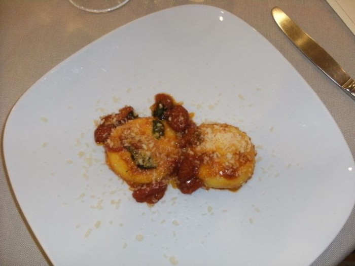 Per antipasto abbiamo scelto prima il coreografico ed appariscente Finto crudo di gobbetti (gamberi) e carciofi. Freschezza che sale su fino alle orecchie. La dolcezza dei crostacei è ottimamente stemperata dall’amarognolo dei carciofi pestani d’incomparabile voluttà. Piatto sicuramente ben centrato.