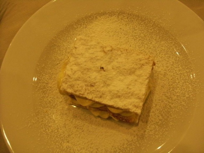 Il pesce poi non è per niente sapido e si armonizza perfettamente con la pasta. Grande piatto sicuramente. Passiamo ai secondi. Qui abbiamo scelto una portata semplice e gustosa come le Polpette di carciofi (non dimentichiamoci che siamo in un territorio privilegiato e altamente vocato, dove il carciofo rappresenta il simbolo stesso di Paestum insieme con la mozzarella di bufala naturalmente) e poi il Merluzzo gratinato al limone, con insalatina e crema di patate. Voluttuosa ed equilibrata elaborazione, pur nella sua apparente semplicità. Pesce freschissimo, con croccante impanatura, saporito, delicato ed invitante, tanto che ho subito cominciato a mangiarlo, dimenticandomi per un momento di scattare la foto.