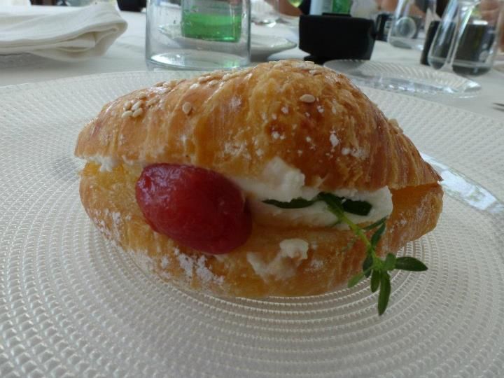 A sorpresa arrivano dalla cucina soffici croissant con crema di mozzarella di bufala e confettura di pomodoro.