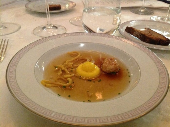 Vito è un cuoco dotato di tecnica perfetta, matura e consapevole. Come tutti coloro che hanno lavorato nelle grandi strutture, riesce sempre a trovare il giusto equilibrio tra estro creativo e necessità di far alzare tutti contenti e soddisfatti da tavola. Per fare questo serve totale padronanza del mestiere, la giusta nota ruffiana in ogni piatto e al tempo stesso esprimere una idea precisa e non confusa dell’ingrediente principe. I passatelli sono stati sicuramente uno dei piatti della serata, con un brodo finissimo ed elegante, al tempo stesso ricco di sapore. Per precisare e numerare quello che voglio dire: per me questo è un piatto da 18 che senza il parmigiano sarebbe da 19.
