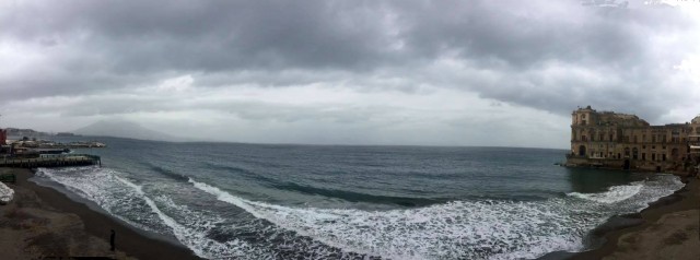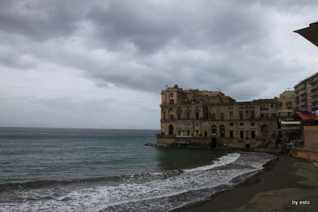 Di là si vede lontano il vulcano con la penisola sorrentina; all’orizzonte c’è Capri; di qua, a picco sulla spiaggia, c’è il Palazzo Donn’Anna.
