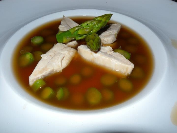 Come antipasto io e la mia compagna di tavolo scegliamo due diverse strade: quella del pesce e quella terragna. Il mare è quello che piace a me. Hard. Tosto. Senza mezze misure: lattume di ricciola cotto al vapore in brodo aromatico al tonno secco e salsa di soia, bianco d’uovo, profumo di noce moscata ed asparagi. Attirata dall’idea del brodo e, soprattutto del lattume (le gonadi del pesce). Un piatto deciso, gustoso, solo leggermente addomesticato dagli asparagi e dall’albume dell’uovo che si rapprende nel piatto un po’ alla volta, sorso dopo sorso.