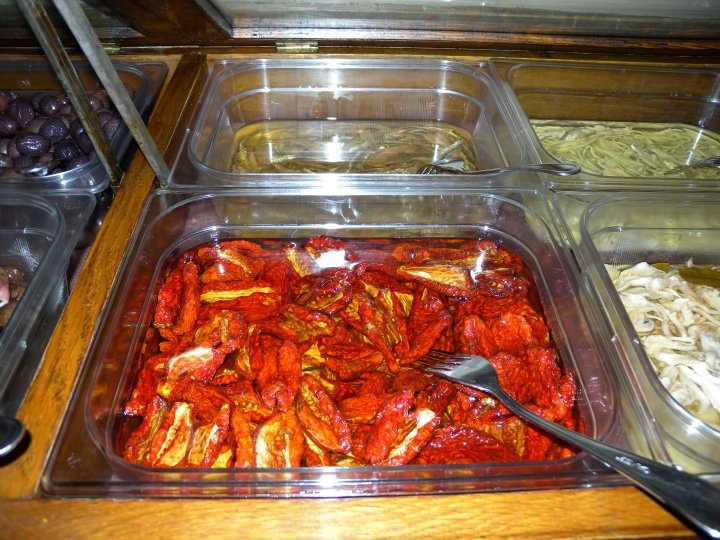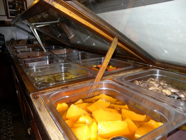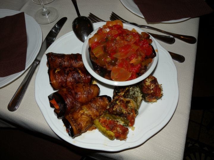 Nella prima sala una distesa di contenitori custoditi in un bel mobile in legno, piccoli pozzi di golosità, con decine e decine di antipasti e verdure, fiore all’occhiello del locale: pomodori secchi sott’olio; alici marinate, zucca in agrodolce; fantastiche e gigantesche olive, funghi, sarde a beccafico, caponata di melanzane, zucchine ripiene, delle ottime e dolcissime cipolle di Giarratana in grado di far ricredere anche i più decisi detrattori di questo bulbo.