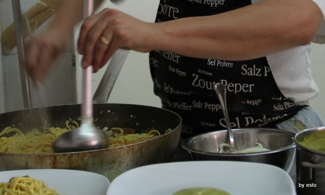 Un salto in cucina tra i fornelli. Si stanno preparando i tagliolini di pasta all’uovo ai frutti di mare e vellutata di asparago.