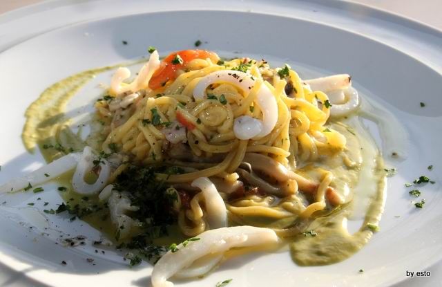 Buoni e belli. Fatti a mano con solo tuorlo e farina. La julienne di seppie e la vellutata di asparagi al fondo si contrastano, ma giocano di squadra.