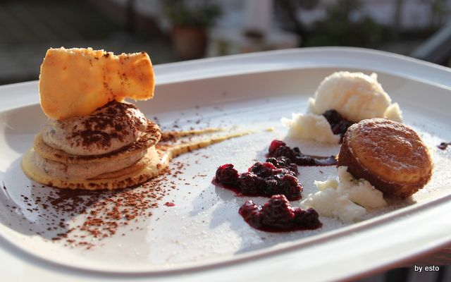 Millefoglie di castagna con il suo sufflè, gelato al cocco, gelato allo zenzero e yogurt e salsa di frutti di bosco.