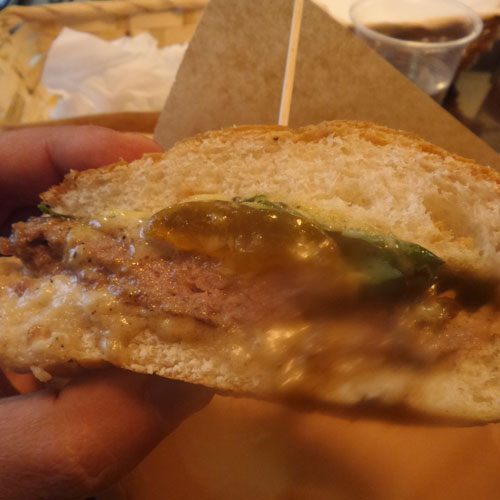 Il primo farcito con hamburger di manzo, pancetta affumicata, cipolla caramellata, provolone Valpadana, ketchup e maionese artigianale si presenta compatto con un pane dall’impasto morbido e di grande estensibilità che non cede e si rompe alla base, segno spesso di un cattivo bun industriale. Buono davvero.