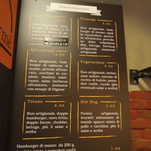 Essenziale anche la proposta dei panini che si limitano al momento e volutamente a sette soltanto dei quali sei con hamburger, di cui uno vegetariano confezionato in casa, e uno con wurstel artigianale.