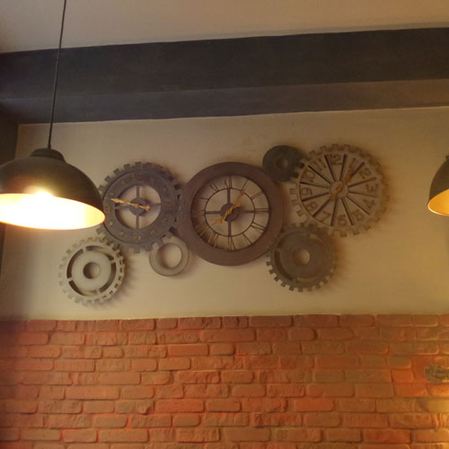 L’architettura molto post industriale ha continui richiami alle fabbriche di fine ottocento con grossi ingranaggi appesi ai muri e pareti in mattoni rossi con vistosi tubi che terminano con lampadine a basso voltaggio.