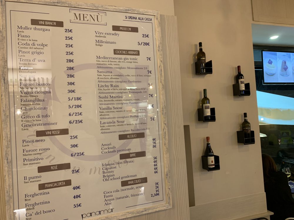 Non solo crudo ma anche qualcosa di cotto così come non possono mancare le sfizioserie fritte quali calamari o baccalà. Poche bottiglie di vino ma ben selezionate.