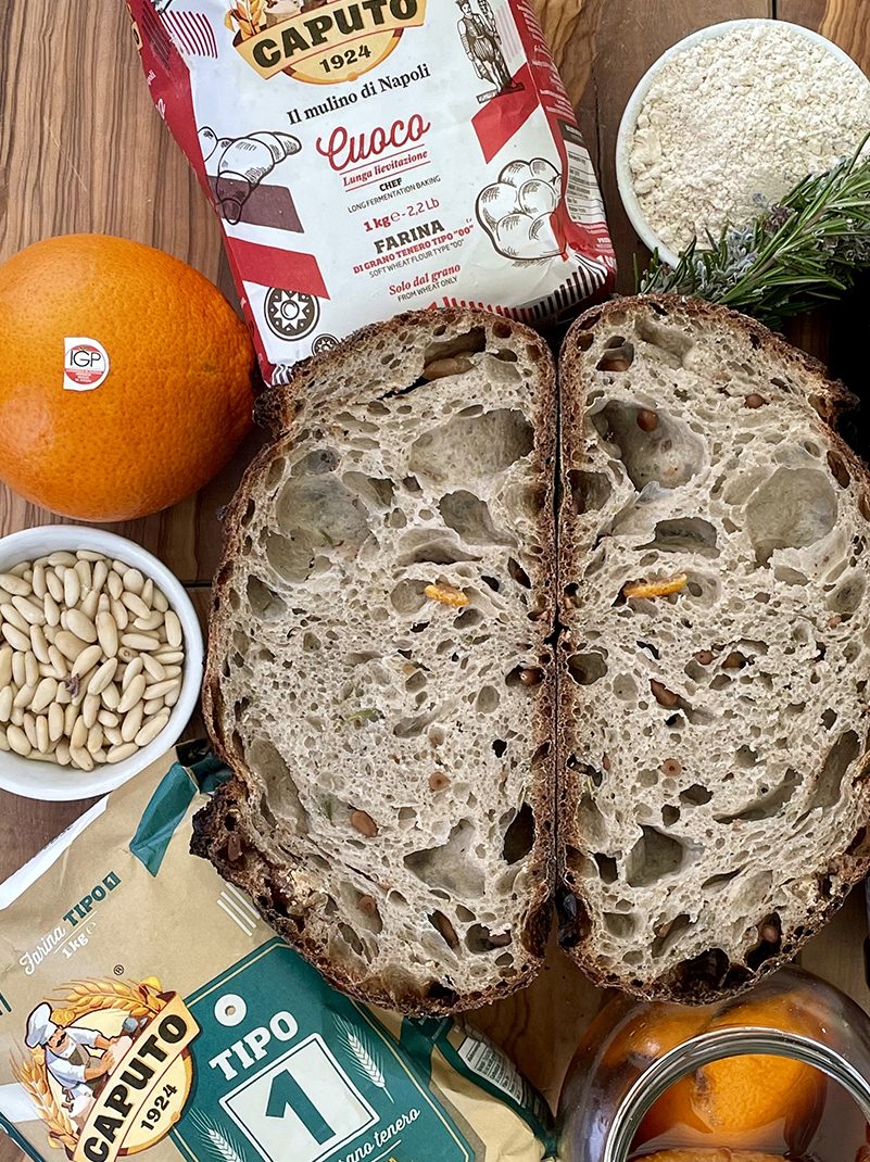 Come prima operazione, rinfrescare il lievito madre e attendere che arrivi a raddoppiare il suo volume. Successivamente, inserire nell’impastatrice tutta la farina, la polenta di castagne e 300 ml di acqua. Azionare la macchina in prima velocità fino ad ottenere una massa impastata, senza far incordare eccessivamente l’impasto. Coprire quest’ultimo, per evitare che si secchi in superficie, e lasciar riposare 30 minuti. Aggiungere poi, il lievito madre liquido, il sale e una piccola parte di acqua. Successivamente, far ripartire in seconda velocità fino a quando l’impasto non avrà assorbito tutti gli ingredienti messi in precedenza. Proseguire continuando ad inserire la restante parte di acqua, fino a quando non si otterrà una maglia glutinica tenace ed estensibile. A bassa velocità poi, unire i pinoli, la scorza d’arancia e il rosmarino. Trasferire l’impasto in un contenitore leggermente oliato e trasferire a maturare in cella di lievitazione ad una temperatura di 26 °C.