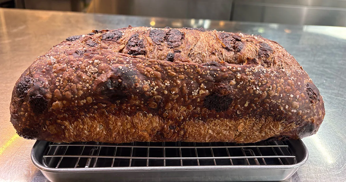 La sera prima di realizzare l’impasto, effettuare il rinfresco del lievito madre con la farina manitoba Oro e lasciar riposare fino al mattino seguente. Unire la farina, 600 g di acqua e il cacao amaro ed impastare, effettuando poi un fermo macchina di 2 ore. Trascorso il periodo di riposo, unire 200 g di lievito madre liquido, 100 g di acqua e il sale e impastare fino alla formazione di una buona maglia glutinica. Aggiungere 100 g di acqua a più riprese, i 600 g di cioccolato e continuare ad idratare l’impasto poiché il cioccolato tenderà ad asciugarlo. Trasferire l’impasto sul piano di lavoro ed aprirlo, per eliminare lo stress di lavorazione. La temperatura finale ideale è di 26 °C. Trasferire l’impasto in un contenitore e lasciar lievitare in massa per 5 ore, effettuando una piega dopo la prima ora di riposo. Effettuare la pezzatura e dare una preforma tonda, lasciando riposare nuovamente per 30 minuti. Formare le pagnotte e trasferirle in frigo a 4 °C per 15 ore. Al mattino seguente, farle lievitare nuovamente per 2 ore, effettuare un taglio longitudinale nel pane ed inserire all’interno del burro. Cuocere a 210 °C per i primi 10 minuti, poi a 180 °C per 30 minuti e quando risulterà cotto all’interno, concludere la cottura a 96 °C.