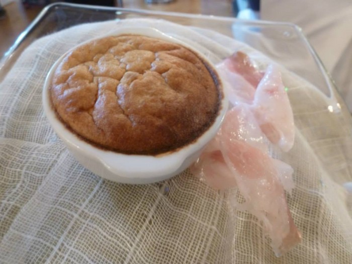 Stufate le cipolle nel burro con l’aggiunta di un pizzico di sale. Quando hanno assunto un colore nocciola, lasciarle raffreddare; una volta fredde, sistemate le cipolle in un mixer dove le frullerete con l’aggiunta dei tuorli d’uovo ed il pecorino Carmasciano. A parte montate i bianchi a neve ed aggiungeteli nel composto che dovrà diventare una base ‘soufflè’; montate quindi il soufflè’ in una ‘cocotte’ di porcellana, mettendo come base il pane raffermo con una spolverata di anice stellato e, a coprire, il composto ottenuto precedentemente. Cuocete in forno non ventilato a 180° fino a farlo ‘soffiare’.