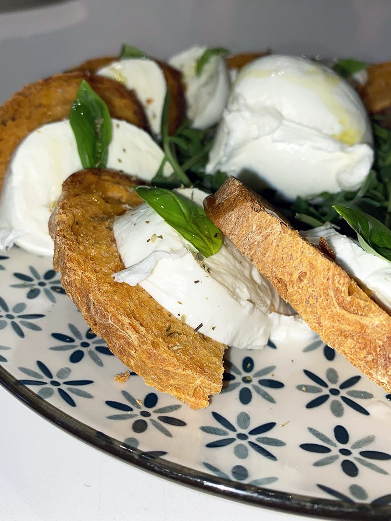 Servire il pane al pomodoro accompagnato da basilico, origano selvatico e Mozzarella di Bufala Campana DOP.