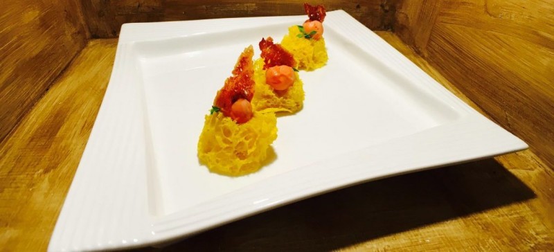 Per la cialda croccante, mescolare il doppio concentrato di pomodoro con il glucosio, ottenendo così una crema semi-liquida. Stendere tra due fogli di silpat ed infornare a 170° C per circa 40 minuti, assicurandosi periodicamente che il composto abbia ottenuto la necessaria caramellizzazione. Una volta raffreddata, separare i due fogli di silpat, in modo tale da ottenere delle cialde irregolari.