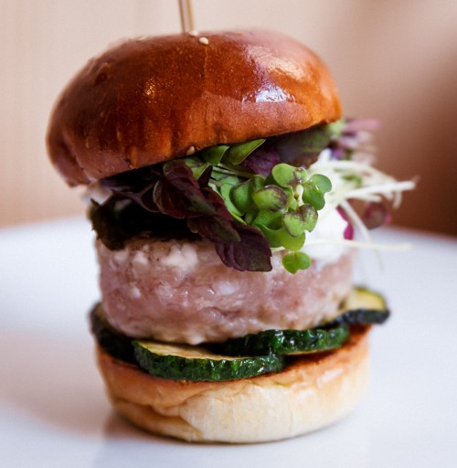 Hamburger di Palamita, Spuma di ricotta di pecora, Zucchine alla scapece, insalatina di Shiso, Ketchup di Rapa Rossa.