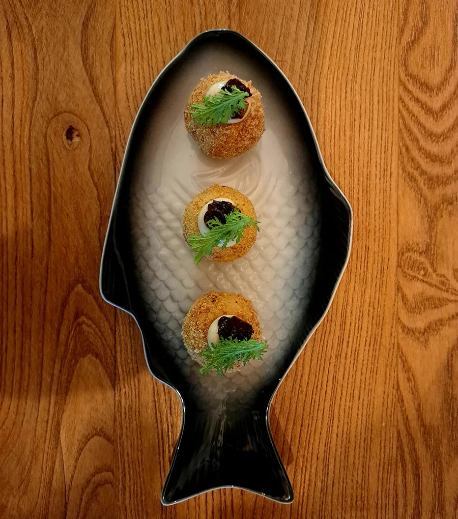 Preparare un risotto, senza soffritto, ma con solo riso e acqua. Al momento della mantecatura, aggiungere i fagioli frullati, il parmigiano, il burro, la trota precedentemente tritata e le verdure, tagliate alla brunoise. Lasciar raffreddare e preparare la maionese, aggiungendo alla stessa la bottarga. Una volta che il riso si sarà freddato, formare delle palline da 35 g l’una ed aggiungere, all’interno di ognuna, 5 g di formaggio erborinato. Panare dapprima la palline di riso nell’uovo e poi in una miscela di pane grattugiato e polenta. Friggere fino a perfetta doratura.