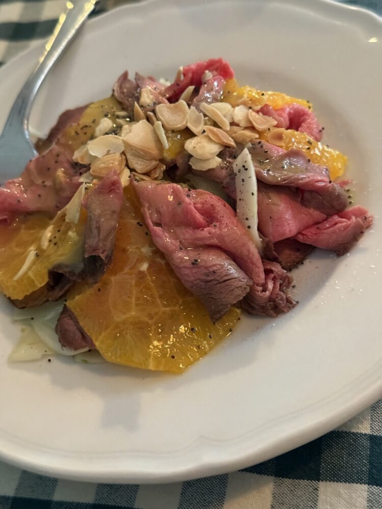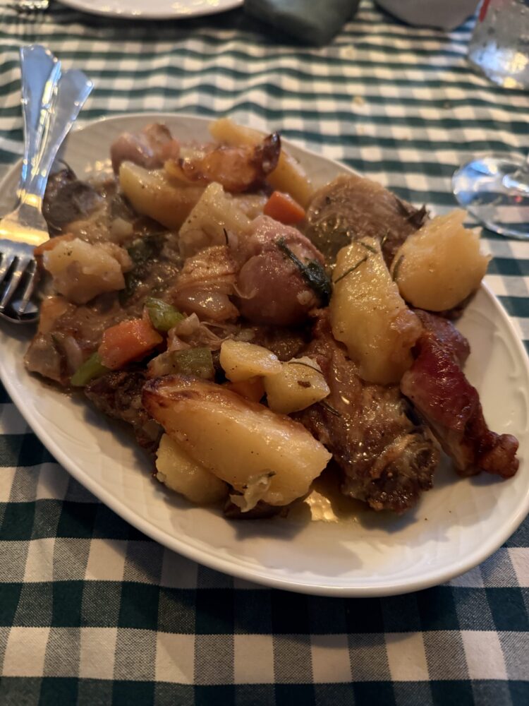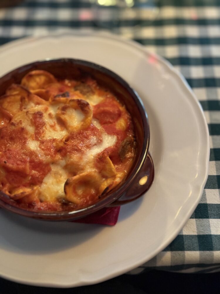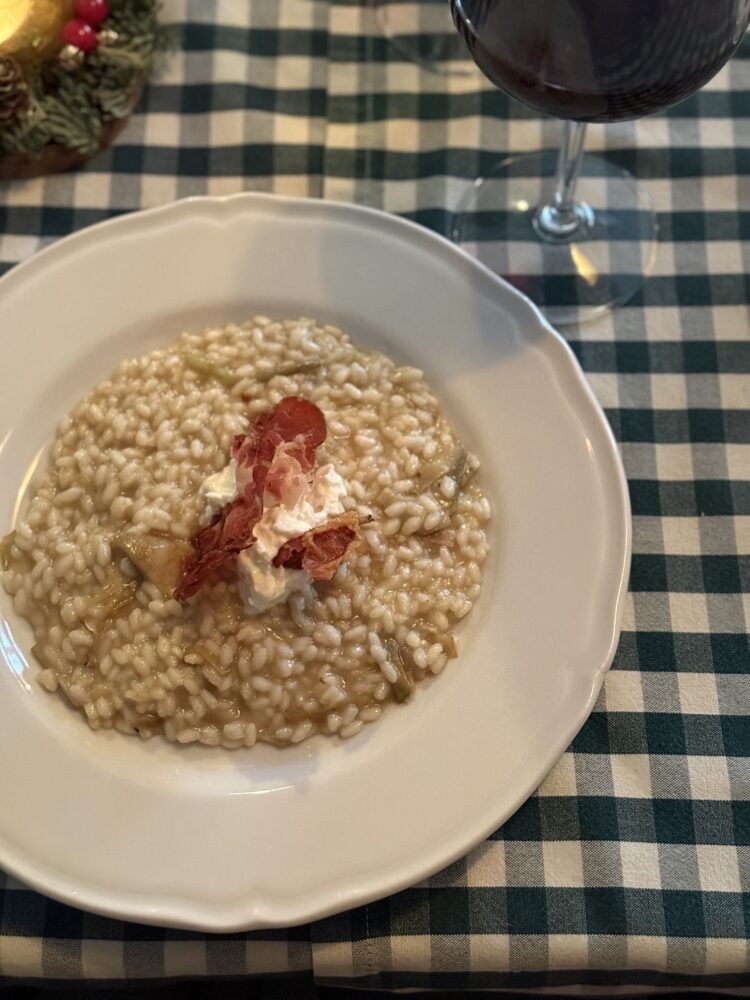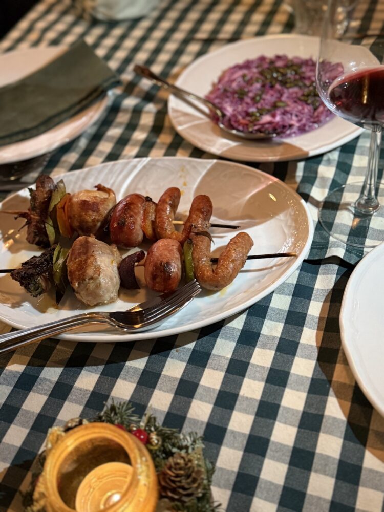 Accanto, i piatti costruiscono profondità e continuità: il risotto ai carciofi con capocollo croccante e burrata affumicata lavora per stratificazione, mentre lo spiedino arrosto, che riunisce salsiccia, punta di coltello, zampina, bombetta, gnumarelli e verdure, restituisce il senso del fuoco, della condivisione e del tempo che si allunga intorno a una tavola.