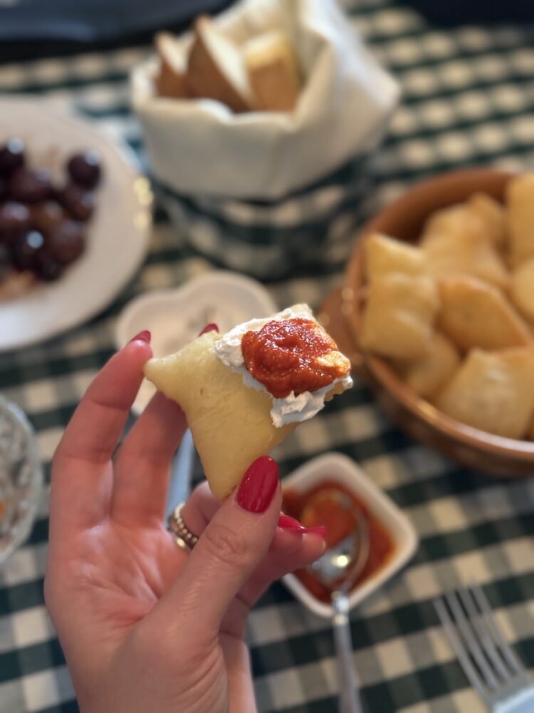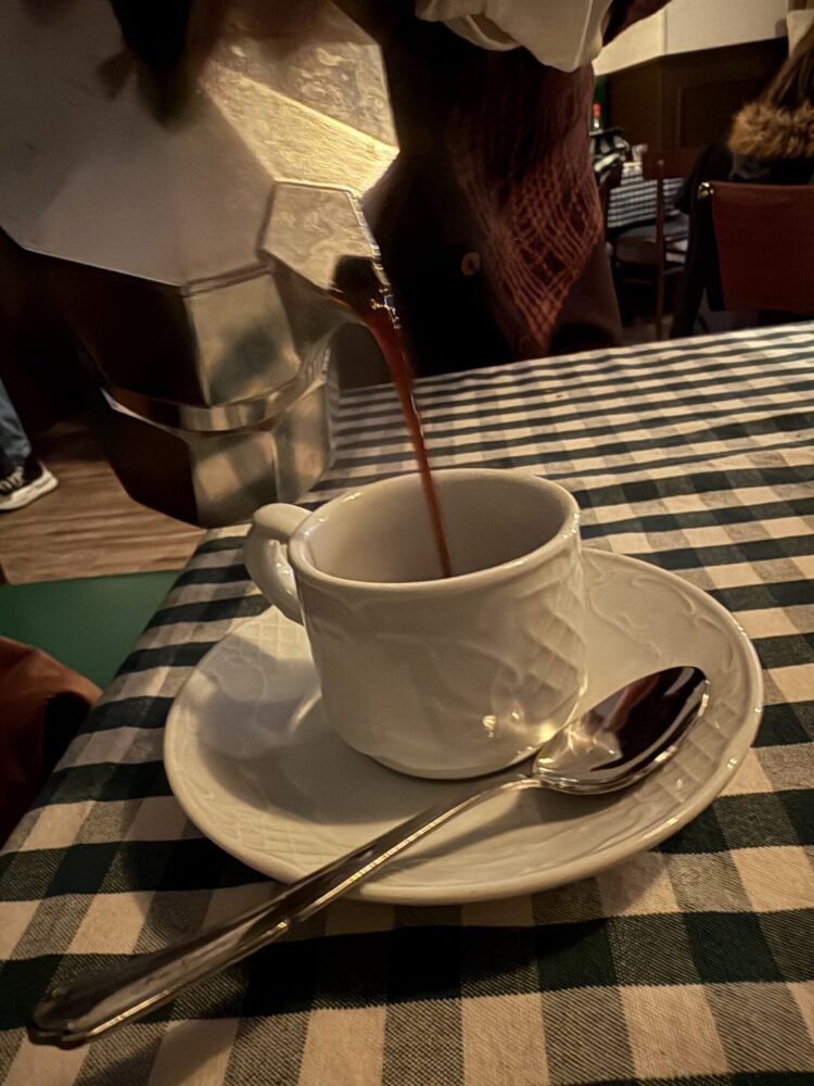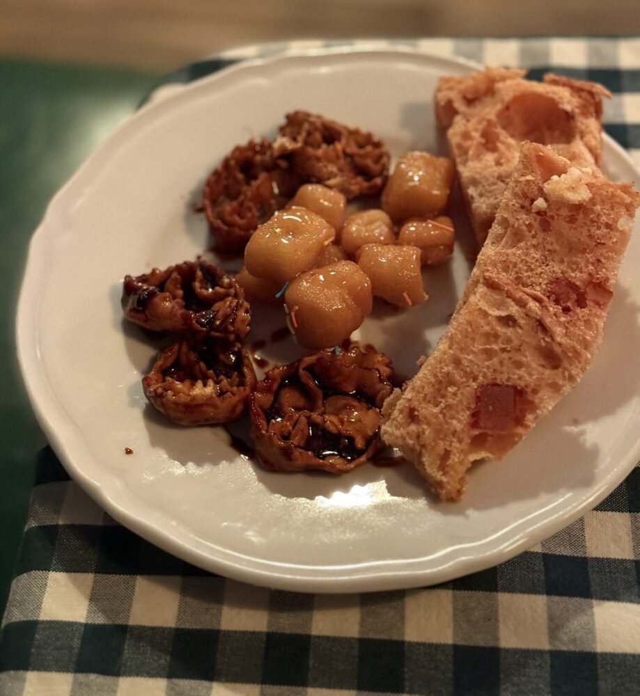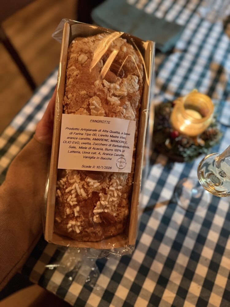 Il momento del dolce prosegue senza stacchi, con i dolci delle nonne, cartellate e purceddhruzzi, portati a tavola come gesto di festa condivisa. Accanto, trova spazio anche il panettone artigianale Pangrotte, firmato dallo chef Mancini, inserito con naturalezza nello stesso percorso di cura, artigianalità e territorio. Il caffè, servito dalla moka, riporta il racconto a una dimensione domestica, dove i dettagli contano quanto i piatti.