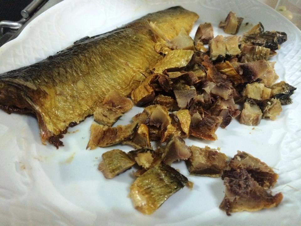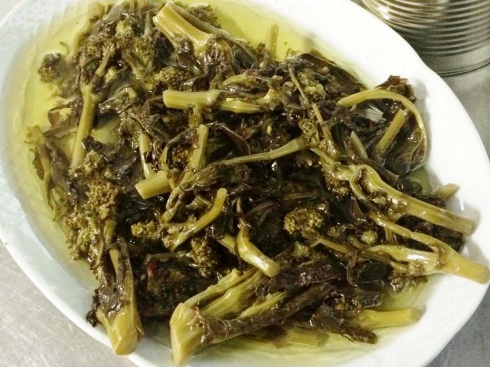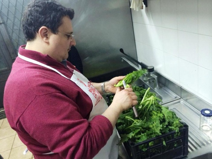 La traccia del problema è: come stemperare il retrogusto acidulo determinato dal succo di limone e dall’aceto aggiunto nell’acqua di scottatura del broccolo per rendere il prodotto sicuro nell’edibilità. Non avevo nemmeno finito di “dettare la traccia” che già lo vedo al lavoro. Sceglie due soluzioni da contrapporre all’acidità: i ciccioli di maiale e l’aringa affumicata.