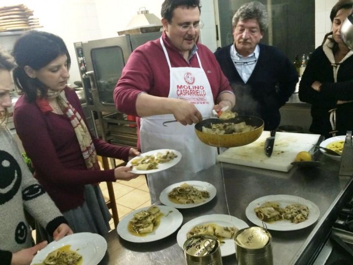 Insomma, nonostante le sue origini siciliane, ormai lo chef Barrale è patrimonio dell’Irpinia!!! ;-)) Sempre molto attento alla biodiversità, e questa è stata una delle qualità che gli hanno fatto guadagnare la vice-presidenza della CHIC (Charming Italian Chef), è alla costante ricerca di prodotti dimenticati o poco conosciuti. I suoi menù abbondano di chicche riscoperte anche grazie al suo lavoro. La sua è una cucina di mediazione, grande rispetto per la materia prima della quale ama sviscerarne tutte le potenzialità, ma anche tecnica ed innovazione espresse all’ennesima potenza. Gli faccio trovare una bella dose di materia prima, fresca (direttamente dall’orto dell’amico-produttore di Paternopoli, Quirino Di Benedetto) e in prove di trasformazione in latta, che avevamo a deposito dagli ultimi esperimenti fatti presso un’azienda conserviera di S. Valentino Torio.