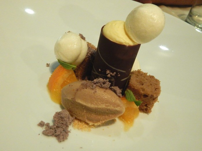 Cannolo di cioccolato…(Crema di mascarpone al privilegio, Arancia candita, biscotto al caffè e polvere d’olio). Provvidenziale la spiegazione – “Il Privilegio è un vino da dessert che viene solitamente abbinato alla frutta secca o al miele; la mia sfida è stata osare con ingredienti diversi come il cioccolato e il caffè. Quindi ho preparato un cremoso, sulla base di uno zabaione di Privilegio montato al mascarpone, da servire in un cannolo di fondente e l’ho accompagnato con meringa all’arancia, biscotto di caffè al vapore, polvere di cacao, olio al mandarino, gel di arancia, sorbetto al cacao amaro”. Un tripudio di sensazioni goduriose anche questo, d’altronde si sa, Paolo è molto bravo, ma sui dolci…è insuperabile!!!