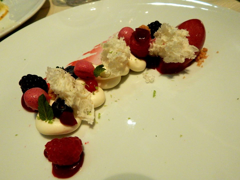 Pina colada….2015 ( Ananas alle spezie, granita al lime, sorbetto cocco e rum). E per la gioia del mio amico Alfonso Del Forno …ci dice Paolo – “Un dolce che può essere consumato da tutti, compresi i celiaci e gli intolleranti al lattosio. L’ananas viene cotto sottovuoto con succo di arancia, miele, caffè e zenzero. In accompagnamento al succo di cottura ci sono il sorbetto di cocco, la granita al lime e ananas, l’aria di rum bianco, la polvere al burro di cocco e il crumble di ananas”. Non sono celiaco, e nemmeno intollerante al lattosio…ma mi è piaciuto lo stesso!!! “Cheesecake”…? (Cremoso al cioccolato bianco e yogurt, crumble e frutti rossi…). Notiamo con piacere la giusta dose di “dolce”, non eccessiva che potrebbe facilmente stancare il palato, ma equilibrata e al tempo stesso “golosa”. Si fonde benissimo con la freschezza dei frutti rossi.