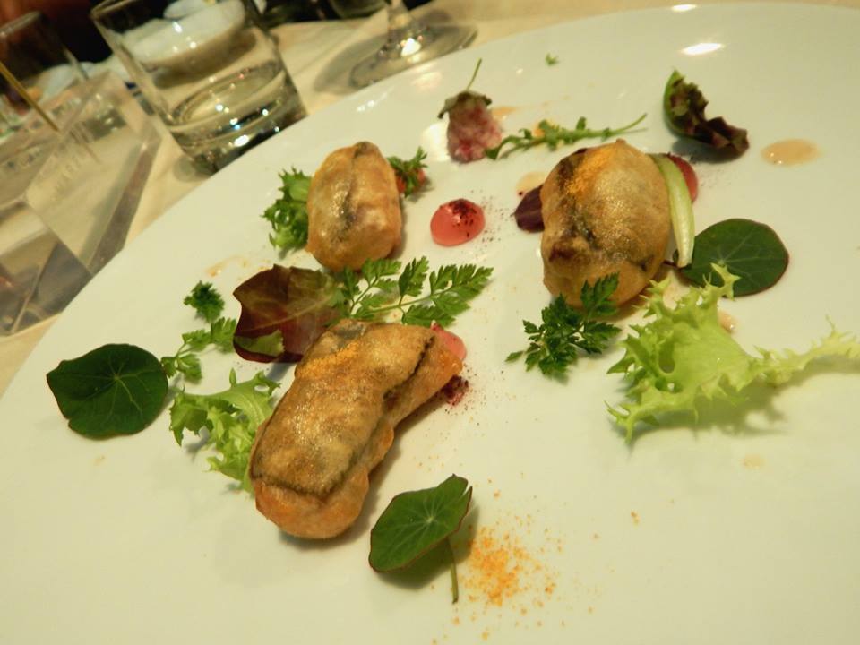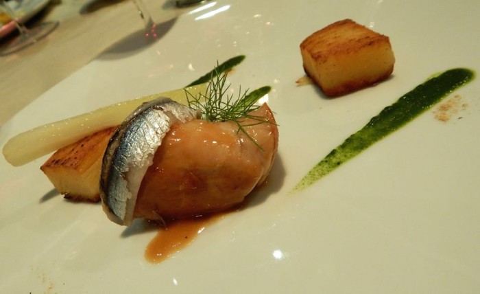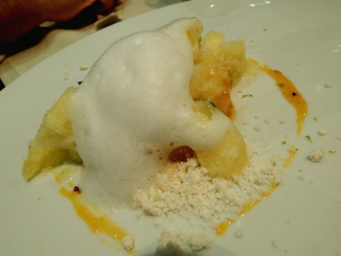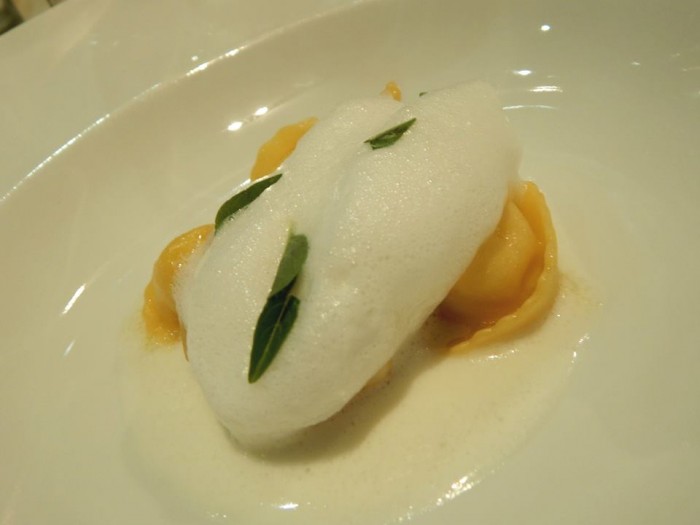 Ci spiega lo chef: “Si tratta di una specie di carpione istantaneo, che ricorda anche la caponata di pesce. Lo sgombro viene marinato in acqua e sale, per rassodarlo, poi fritto con una pastella sifonata. Lo accostiamo a un gel di carpione composto degli odori della ricetta originale, quindi cipolla, carota, sedano, spezie, alloro e ovviamente aceto. E ancora il succo di pepe rosa, ammollato e frullato, per la nota piccante, il ‘wasabi’ di ravanello e rafano, la polvere di arancia essiccata”. Passiamo ai primi: Raviolo di ricotta crema di latte di bufala, basilico e olio ravece. Una pasta tirata a mano, ripiena di ricotta e formaggio grana, sopra una schiuma di latte montata all’olio Ravece, buona soprattutto la pasta, la schiuma di latte ci dà una sensazione di eccessiva dolcezza.