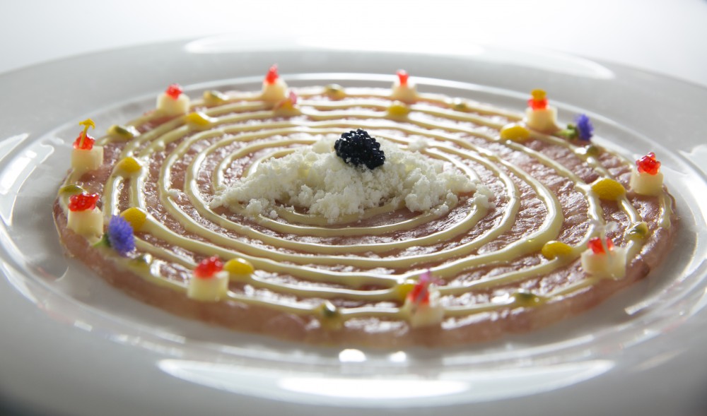 Disco di carpaccio di ricciola con bottoni di chinotto e zeste di yuzo, sale maldon, emulsione di limone, olio extravergine fruttato, neve di mozzarella di bufala e caviale di pesce volante. Presentato a Dubai da Paolo Gramaglia e registratu su www.mysocialrecipe.com