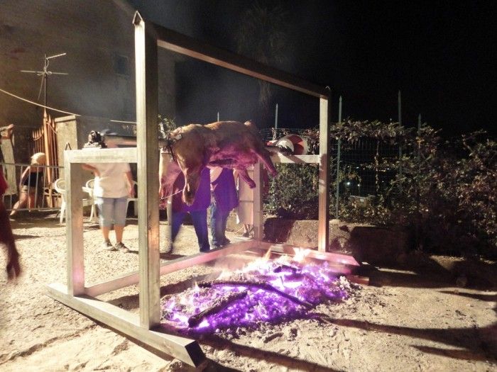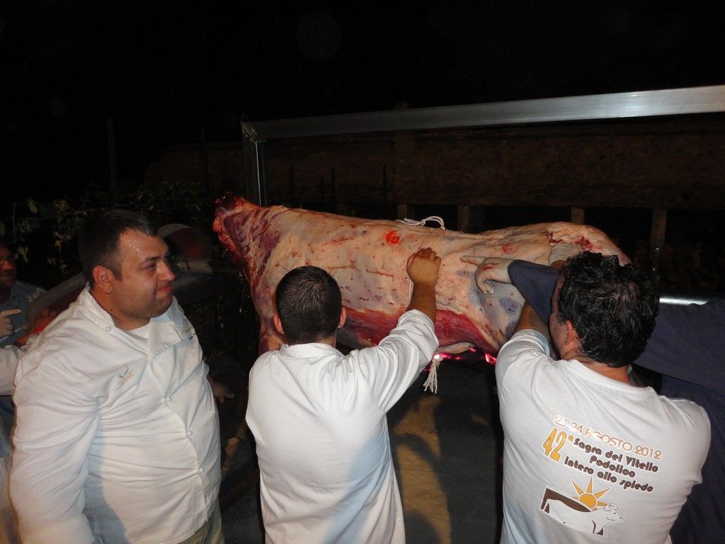 Sono ormai 42 anni che si tiene, a Santo Stefano del Sole, la sagra del vitello podolico. La tradizione ci riporta sino a ventitue anni fa, ultimo anno in cui il vitello offerto dagli allevatori santostefanesi era preparato secondo la tecnica della cottura dell’animale intero, allo spiedo. Da allora, fino all’anno scorso compreso, la sagra del vitello podolico alla brace si è sempre svolta ma la carne veniva cotta già porzionata, tutt’altra cosa, soprattutto in termini organolettici ma anche di scena, rispetto alla cottura originaria. Ed sempre quel “diavolo” di Giovanni Mariconda, patron e chef di Taberna Vulgi, santostefanese doc, a metterci lo zampino…