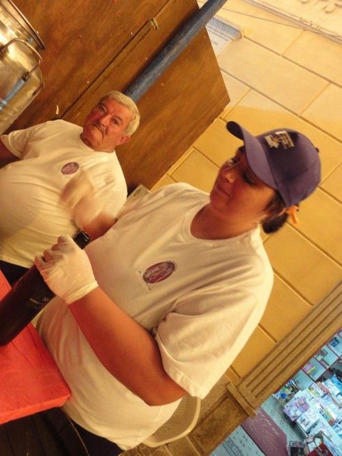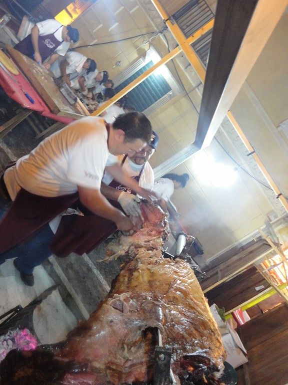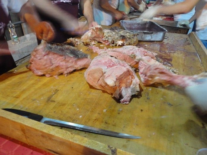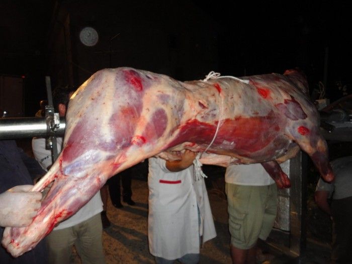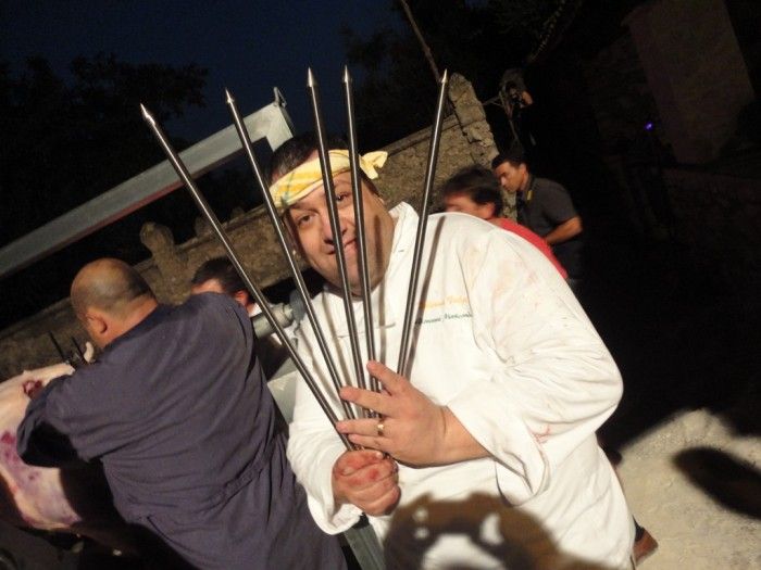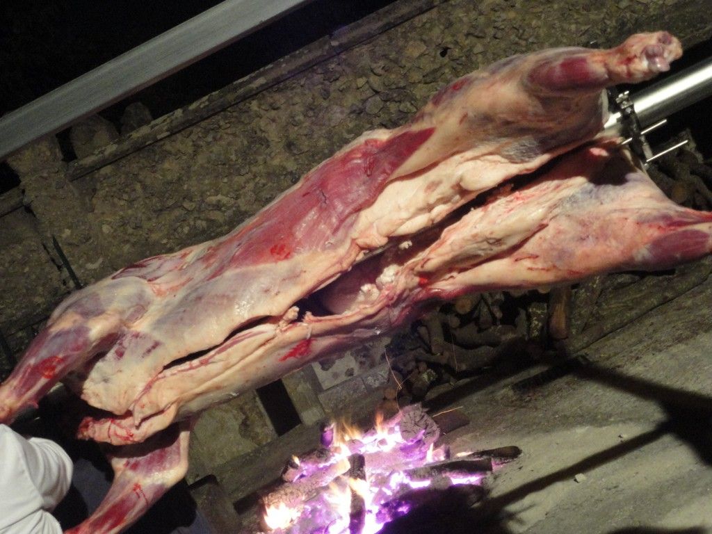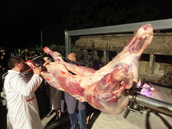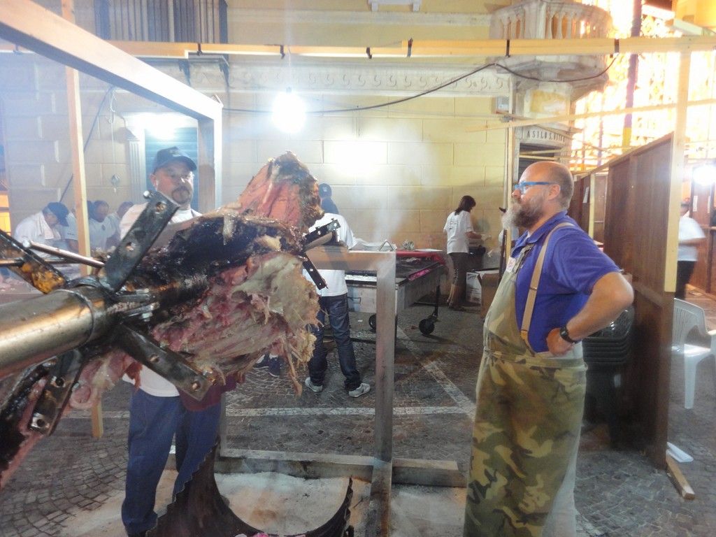Il secondo rischio è l’eventualità di una fermentazione della carne interna, che si può verificare per effetto della temperatura alla quale è sottoposta, tale da portare gli interni dell’animale, per un periodo prolungato( 30/35 ore) ad un livello calorico alto (45°-50°), ma non tale da cuocerli. E questo problema si affronta aprendo molto di più le mezzene dell’animale verso il fuoco, divaricandole in modo da ridurre l’effetto schermatura del calore della brace operato dalle superfici esterne a svantaggio di quelle interne”. Degni di nota, anche gli apprezzamenti di Paolo Parisi per la progettazione e realizzazione dello spiedo, costruito da un artigiano locale, apprezzamenti a tal punto sentiti che mi confessa di averne commissionato uno identico, per sè, nella versione smontabile.Beh, che dire…una tre giorni indimenticabile, bella festa, bella gente, ma soprattutto una tradizione irpina strappata all’oblìo della dimenticanza, unendo insieme in questo sforzo, alcuni dei più bravi operatori del settore accomunati tutti da un interesse superiore : l’uomo, i suoi prodotti ed il relativo territorio al centro del nostro pensiero e quindi dell’azione conseguente. Grazie Giovanni!!!
