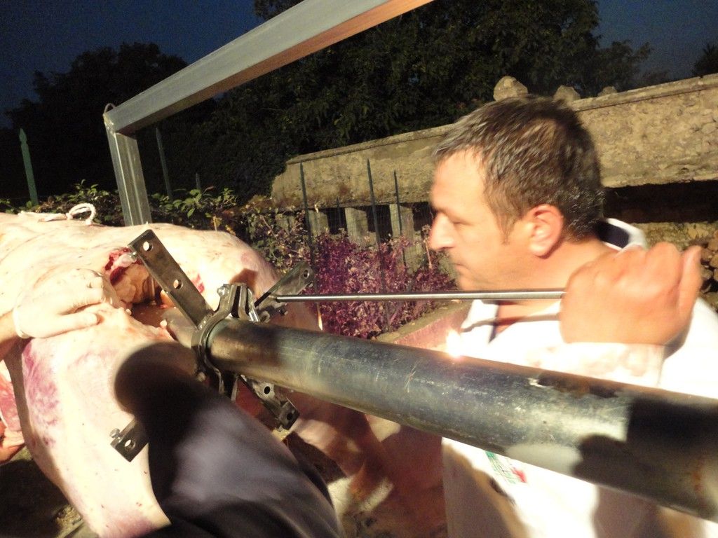 E forse potremo anche evitare che Giovanni Mariconda, dopo aver impegnato il suo brevissimo “quarantottore di ferie” in questo encomiabile progetto…sia di nuovo in treno per Punta Ala, dove è costretto ad “esportare” la sua professionalità… e chiariamoci bene: questo gli fa onore!!! Ma ritorniamo alle questioni più tecniche…circa un’ora di appassionato scambio, fitto fitto, con Paolo Parisi, che mi ha evidenziato i punti critici dell’operazione che secondo lui sono essenzialmente due…” il primo rischio riguarda la stabilità della carcassa sullo spiedo, infatti ad un certo punto per effetto della cottura della cartilagine e dei legamenti che tengono insieme la colonna vertebrale dell’animale, si potrebbe verificare una naturale divisione del vitello in due parti con conseguente contaminazione igienica dovuta alla caduta in terra del pezzo, e questo rischio -continua il Parisi- l’abbiamo scongiurato facendo passare un ferro all’interno della colonna vertebrale, giusto nella cavità dove è allocato il midollo spinale.