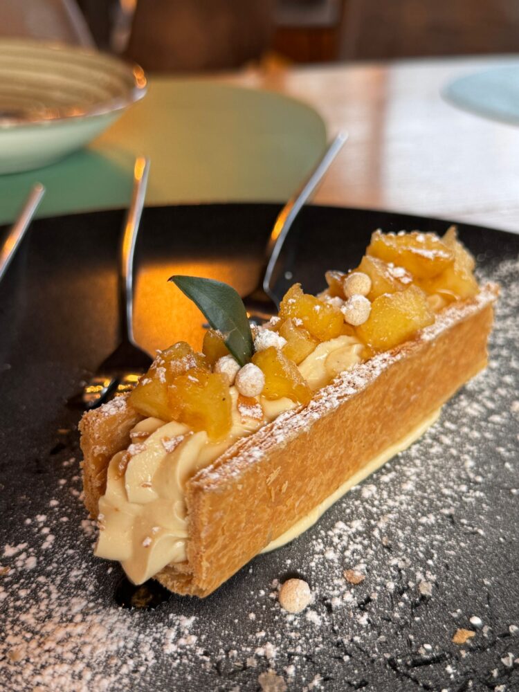 Qui è possibile scegliere anche una grande varierà di dolci. Consiglio il tortino al cioccolato fondente di qualità superiore Ecuador 70% con cuore caldo in aroma di mandarino e gelee di arancia o ancora il semifreddo con mousse di ricotta alla vaniglia del Madagascar con pere Williams candite e cannella su frolla grezza ai fiocchi di sale Maldon e ancora la tarte tatin rivisitata alle mele Renette con cioccolato caramellato al sale e base di pasta millefoglie alla vaniglia del Madagascar, forse quest’ultimo, il mio preferito.