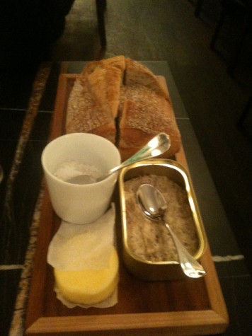 Si parte bene: deliziose e gentili fanciulle in fiore all’accueil, gentile ed iperveloce direttore di sala, tavolo bellino, gente che sbafa pare felicemente. Arriva subito un fantastico pane di campagna con simpatica scatola di sarde con mousse all’acciuga direi parecchio golosa. Tutti felici si parte con semplice insalatina con lardon e aceto balsamico: dignitosissima.
