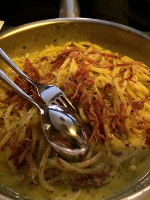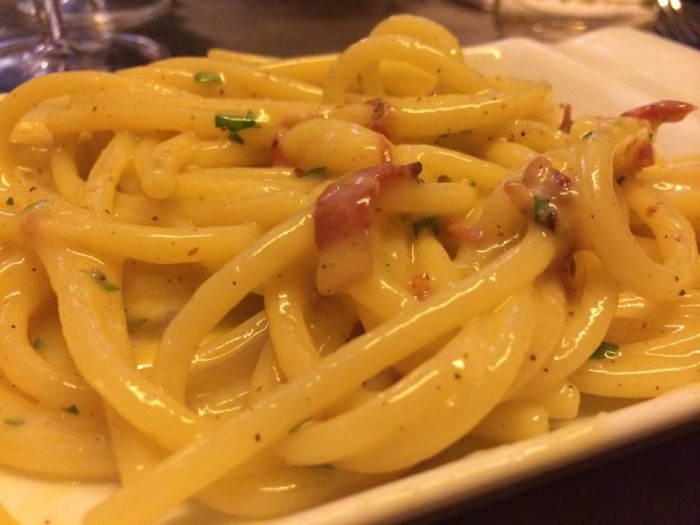 Musica un po’ diversa invece, per la carbonara, altro vessillo italiano. A nostro giudizio l’uovo è arrivato troppo liquido a tavola, quasi scisso con gli spaghettoni (ma perché non i bucatini?), non all’altezza della ricetta oltre che in affanno per un punto in più di cottura (cotti ma non scotti). Ma immaginiamo che sia la migliore carbonara di Parigi:-)