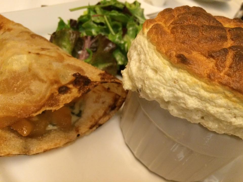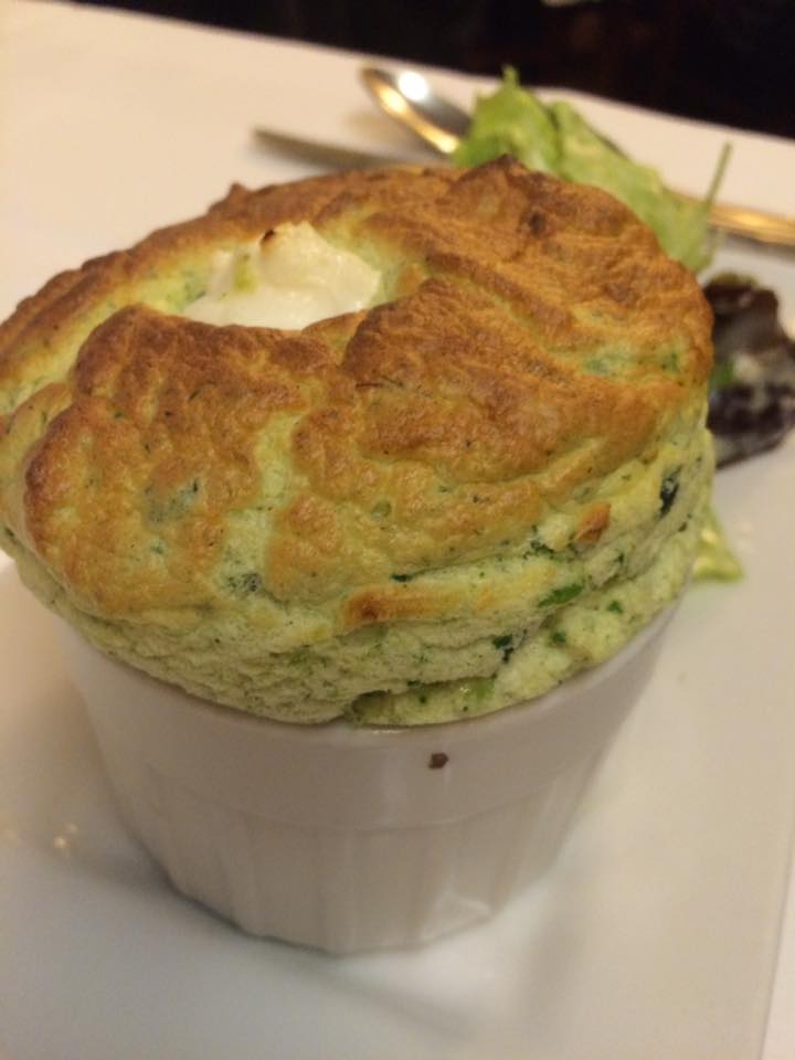 Buono quello agli spinaci, servito con formaggio di capra e insalata; meno convincente quello ai carciofi e merluzzo: i carciofi sono nella salsina che serve a condire l’insalata con pezzetti di merluzzo, ma è poco incisiva e il sapore del soufflè davvero troppo neutro. Meglio senza dubbio quello con pere e roquefort.