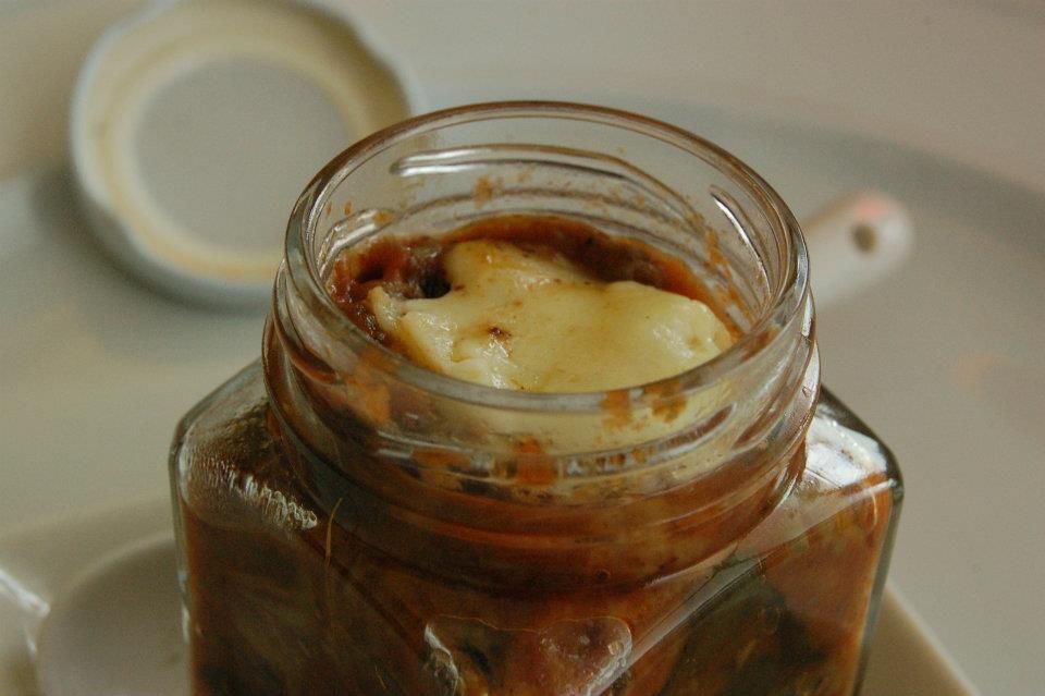 3) La temperatura di cottura non è scritta in ricetta ma non può essere che una bassa temperatura (70 – 80°) dato anche dal fatto che il barattolo si spaccherebbe.