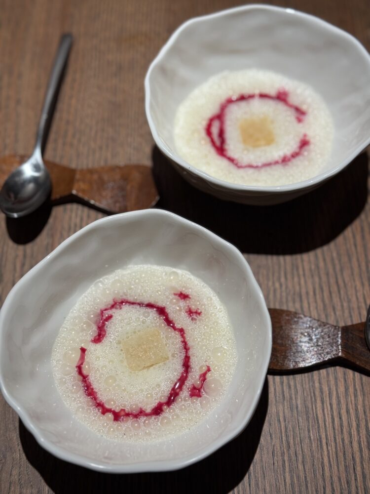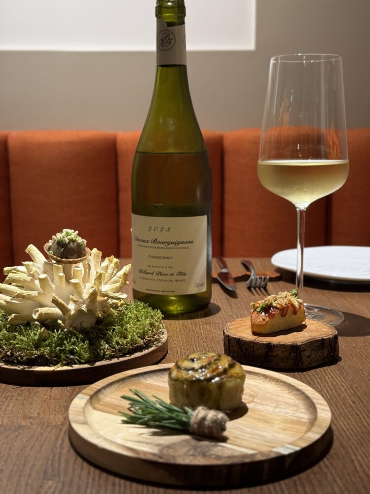 Nel calice, un Chardonnay Coteaux Bourguignons 2023 – Ballard Père et Fils accompagna i piatti come una seconda voce: discreta, luminosa, francese nel portamento e napoletana nel calore. Nulla è casuale. Nemmeno un morso di pane. Tutto nasce dal rispetto per la natura, dai valori trasmessi dai nonni, dal legame con l’orto di famiglia ai Camaldoli, dove Giorgio raccoglie personalmente erbe e stagionali che diventano anima dei suoi piatti.